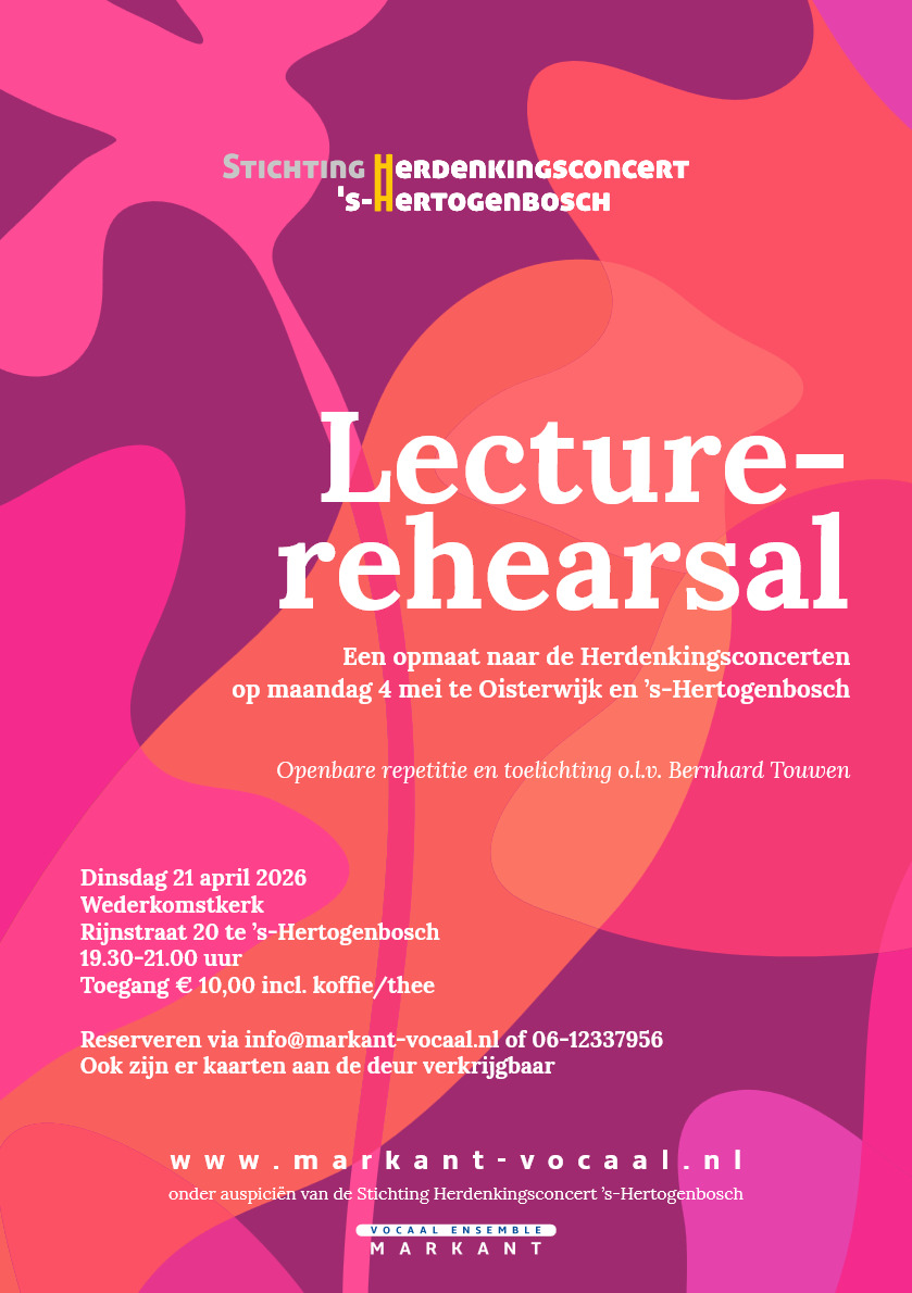 Met medewerking van solisten van het Internationaal Vocalisten Concours ‘s-Hertogenbosch: Irene Hoogveld-sopraan; Annabel Kennedy-mezzosopraan; Mitch Raemaekers-tenor; Michal Karski-bariton, het Herdenkingskoor ‘s-Hertogenbosch en Kamerorkest Concerto Brabant.